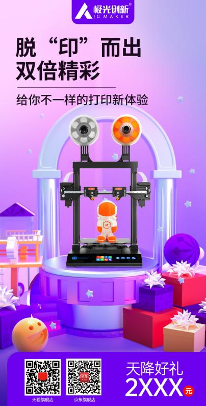 當(dāng)然,除了以上提到的機(jī)型,你還可以在極光創(chuàng)新天貓或京東旗艦店選購(gòu)其它類型的3D打印機(jī)相關(guān)產(chǎn)品。時(shí)值雙十一購(gòu)物節(jié)到來(lái)之際,極光創(chuàng)新旗下多款爆款產(chǎn)品折扣力度驚人,購(gòu)買同時(shí)還有多種好禮相送,對(duì)于近期有購(gòu)機(jī)計(jì)劃的朋友千萬(wàn)不要錯(cuò)過(guò)此次的雙十一購(gòu)物狂歡節(jié)。