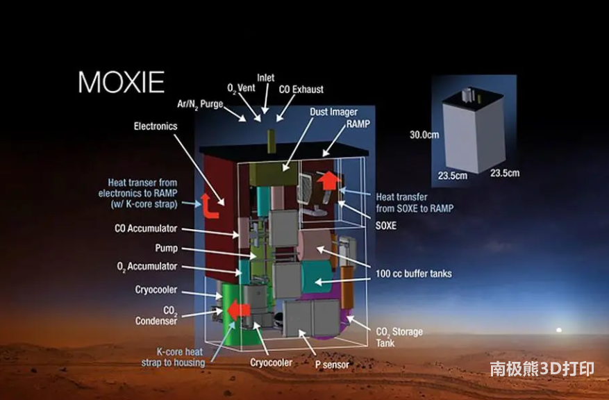 "毅力號 "火星車的其他6個3D打印部件在 "火星氧氣原位資源利用實(shí)驗(yàn) "儀器中,簡稱MOXIE。這個設(shè)備將測試新的技術(shù),未來可以生產(chǎn)工業(yè)數(shù)量的氧氣,在火星上制造火箭推進(jìn)劑,幫助宇航員發(fā)射回地球。
