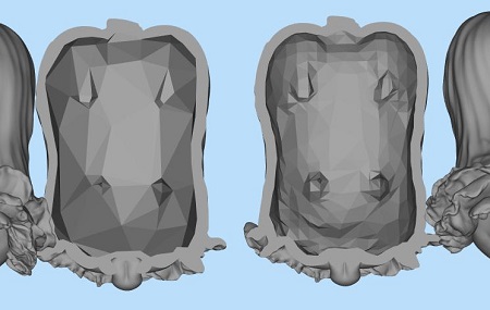 基本上所有光固化切片軟件都支持掏空功能,不過不同軟件掏空算法可能有區(qū)別,掏空的內(nèi)部形狀不一樣。如圖,左側(cè)是赤兔軟件掏空的內(nèi)部情況,而右側(cè)則是用magics來掏空的??梢詫Ρ劝l(fā)現(xiàn),總體上掏空內(nèi)容差不多,但magics掏空后內(nèi)表面更加簡化光滑。更簡潔的內(nèi)表面意味著三角面更少,切片過程更快,減少電腦運(yùn)行壓力,這個對于大量中間模型切片時效用很大。同時也因?yàn)檩^少出現(xiàn)復(fù)雜內(nèi)表面,減輕了內(nèi)部清理的難度。