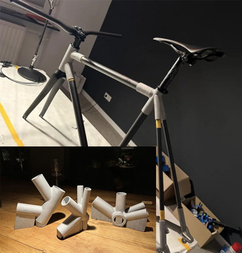 了解到,這輛自行車(chē)采用了碳纖維管+3D打印鋁制連接件的形式拼裝而成。他們?cè)谲?chē)頭、底架、車(chē)座和后下叉周?chē)褂昧?/span>3D打印鋁制連接件,并將碳纖維管連接在一起。