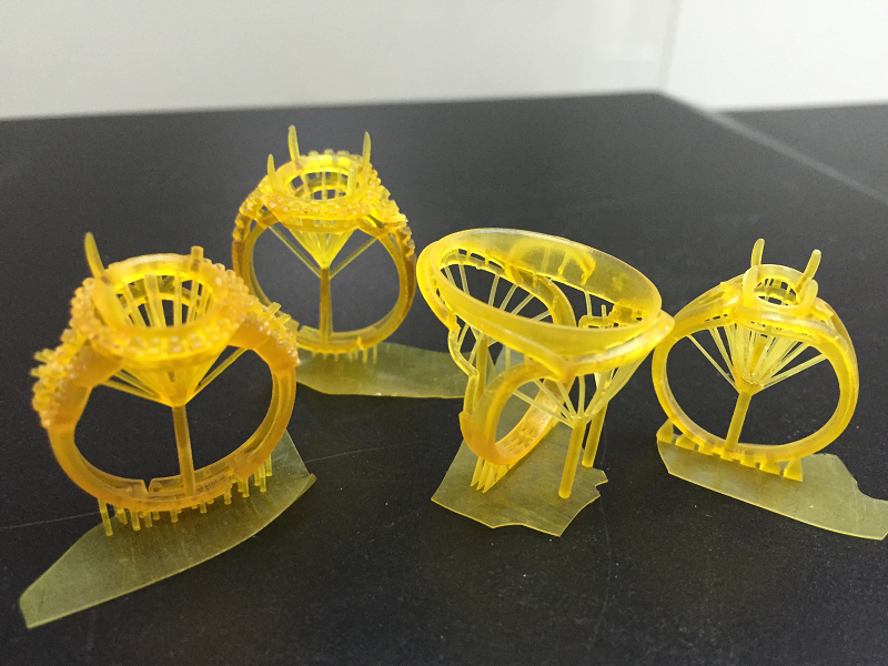 高深點講,光敏樹脂是由光引發(fā)劑,單體聚合物與預聚體組成的混合物,這種材料可在特定波長紫外光聚焦下完成固化,一般用于SLA/DLP機型之中。使用光敏樹脂材料打印出來的物品,表面較為光滑、成型質(zhì)量高,所以許多DLP機型被定為珠寶級別。
