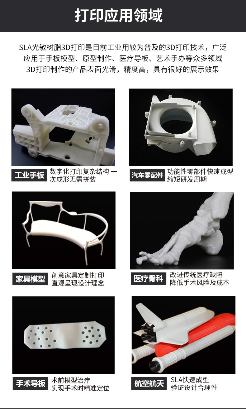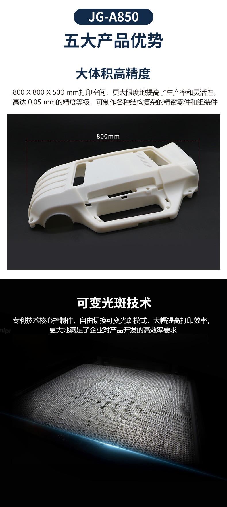 JG-A850 是極光創(chuàng)新自主研發(fā)生產(chǎn)的大尺寸工業(yè)級(jí)3D打印機(jī),擁有800*800*500mm的成型尺寸,可以快速成批量的制做精密零件和組裝件。
